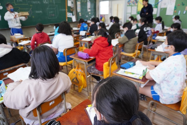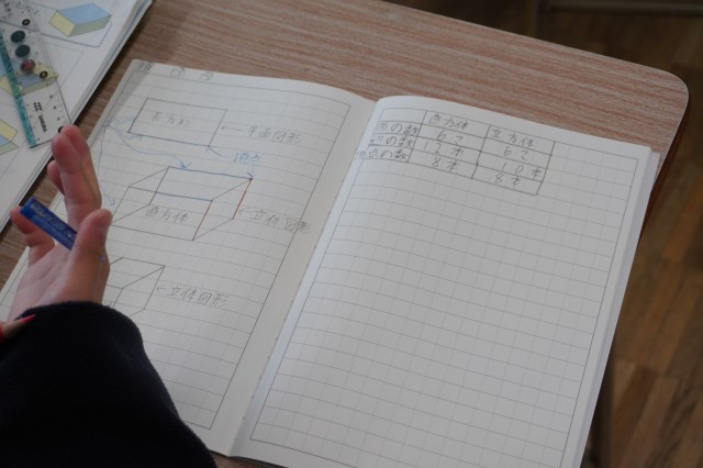4年生算数の授業です。直方体、立方体の面、辺、頂点の数を調べています。