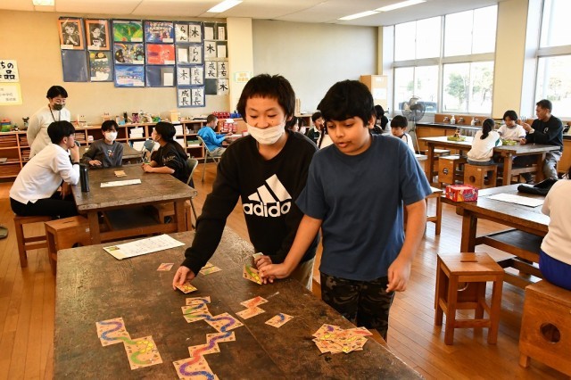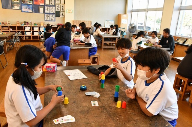 図工室では、ゲームクラブの活動で色々なボードゲームに親しむ高学年の姿が見られました。