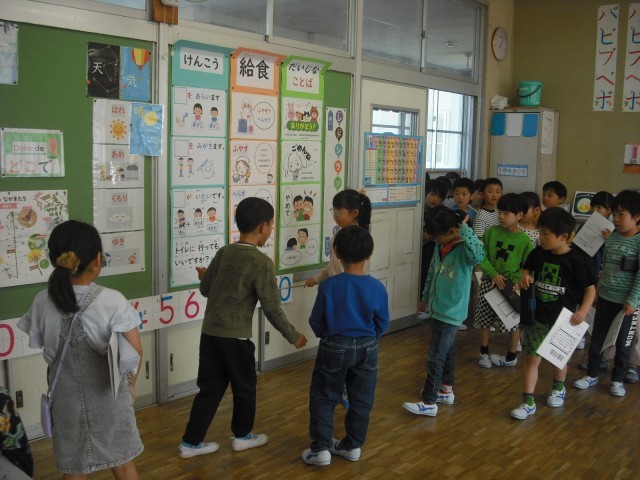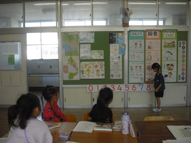 教室に入るときの言葉も、手洗い・うがい・ハンカチの使い方、指し示しながら発表する勉強もも1年生にとって大切なことばの勉強です。