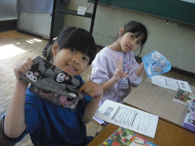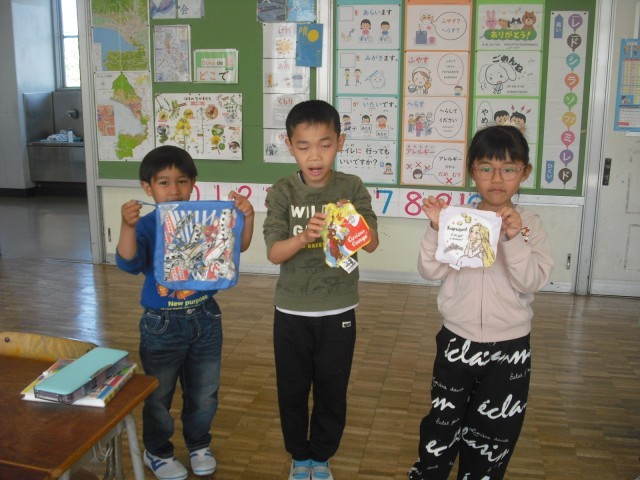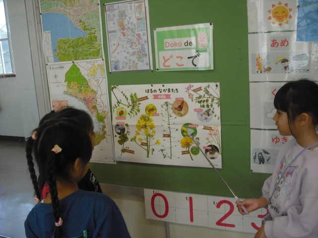 絵カードを見て、日本語での言い方を二人が交代で言っていきます。友達の声もしっかり聞いていました。