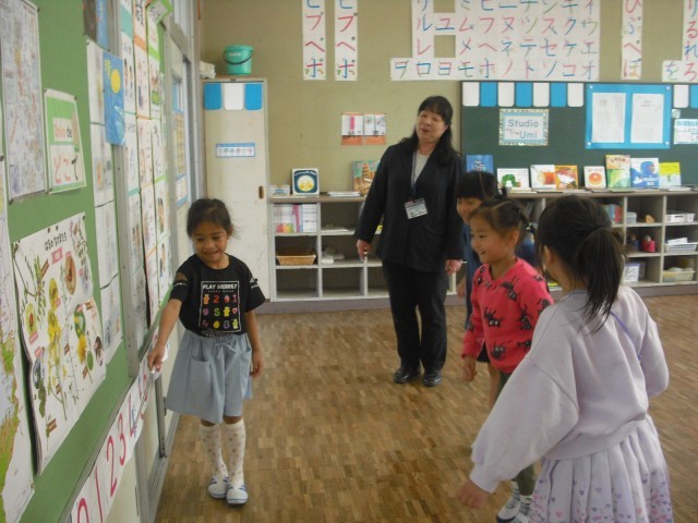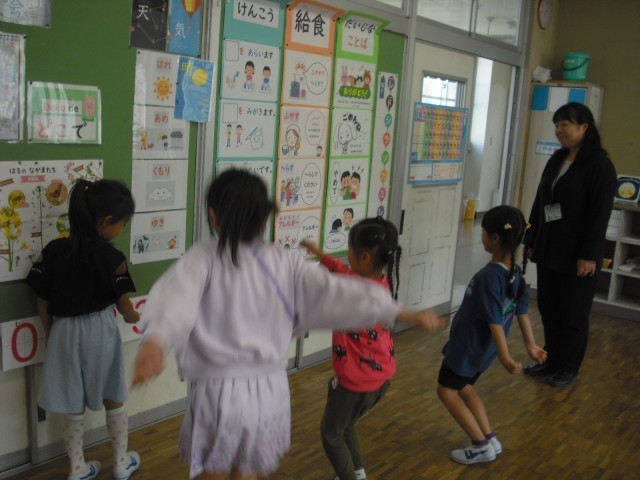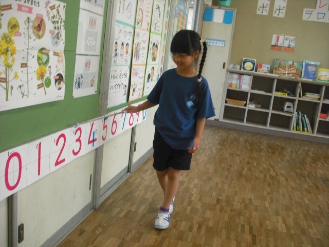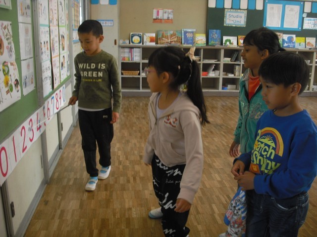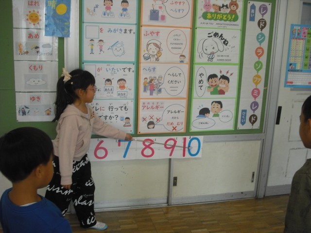 おもいきり からだをうごかしながら 数と なかよしになりました。指示棒(しじぼう)を つかって 発表(はっぴょう)することに なれてきました。来室された校長先生にいっぱいほめてもらい、こどもたちもうれしそうでした。