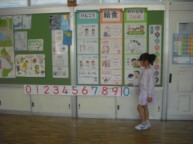 0から10までの数字のカードを、大きな声で読む練習をしていました。ナビゲーターの人が指さす数字のカードを、みんなで笑顔でジャンプしながら読み上げる1年生。楽しく学習しています。