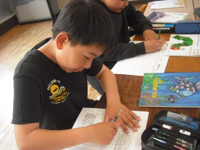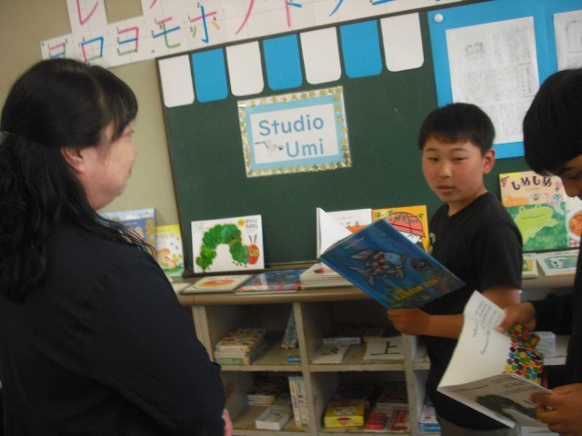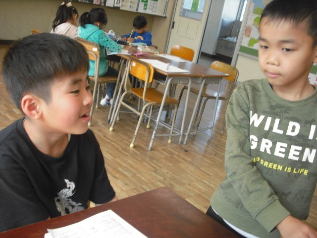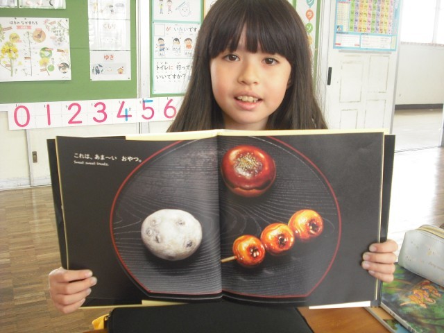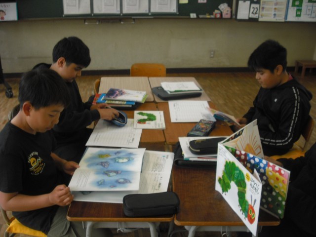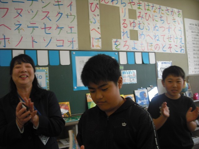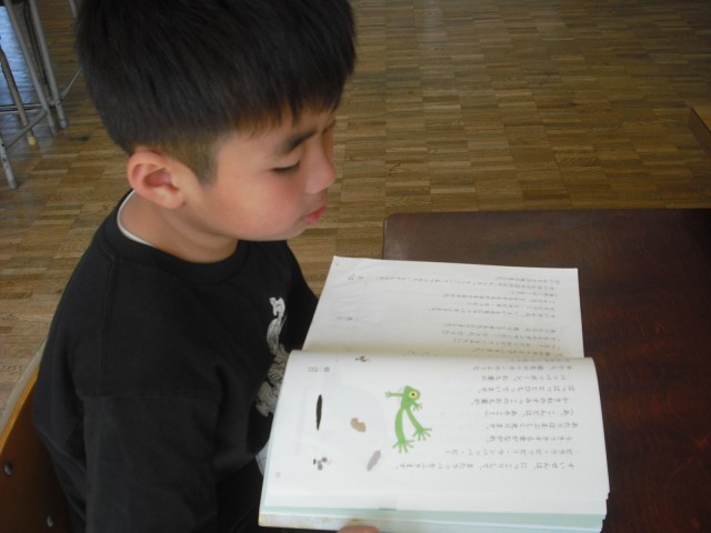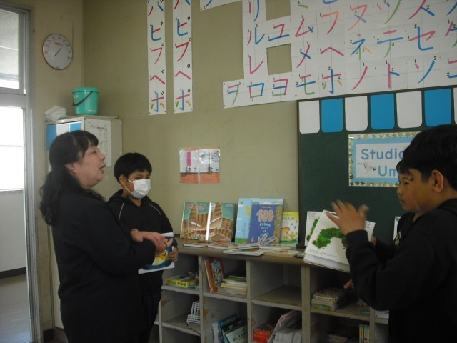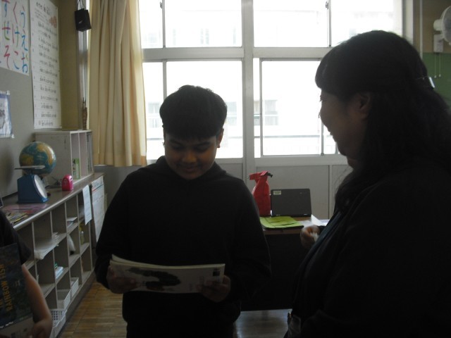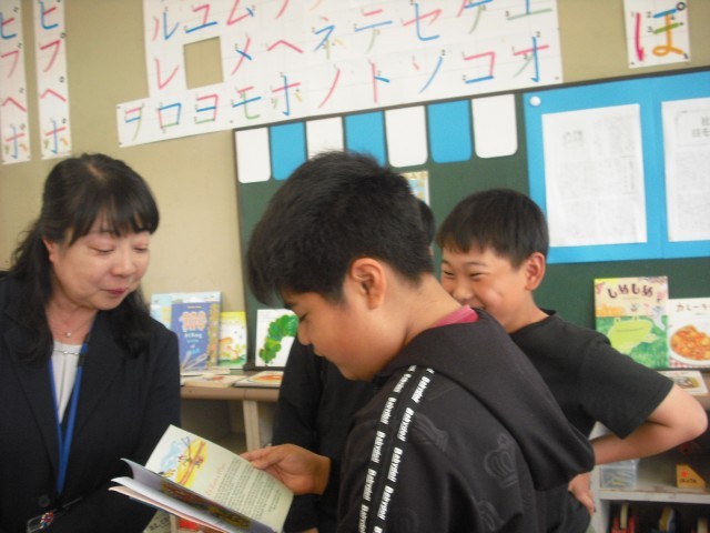 今日のお客様は、教務主任の先生です。低学年の児童は、今日読んだ絵本のおすすめのページを使い、クイズを先生に出しました。意外な答えに驚く先生の様子に満足げでした。さらに絵本に手が伸びて、選んだ絵本を次から次へ読みました。また、高学年が母語で朗読する姿を見て、来日前に培ってきた言葉の力に驚く場面もありました。プレゼンの力もぐんぐん伸びています。