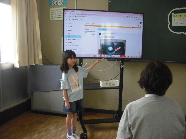 今日のゲストは、校長先生。自己紹介(じこしょうかい)をしました。校長先生の自己紹介も聴きました。「たちうお」を釣(つ)るのが好きな校長先生。「太刀魚(たちうお)って何かな?」Chromebookで検索し、色の美しさに驚き、ドラゴンとよばれる大きなサイズの太刀魚がどのくらいの大きさなのか検索(けんさく)した画像から想像し、協働的に伝えました。月に2回、支援をしてくださる先生の特技(とくぎ)、剣道(けんどう)についても興味深く聴き、「一(いち)の呼吸(こきゅう)」等、体験しました。伝えたい気持ちが高まり、言葉学習(ことばがくしゅう)が意欲的(いよくてき)に進みました。