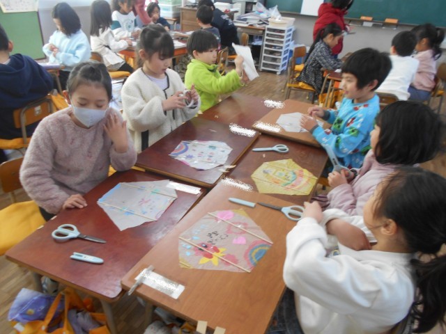 ビニール凧を作っていました。思い思いの絵が描いてあり、かわいい凧です。