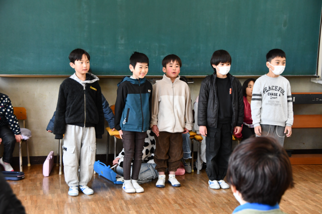 2月10日の参観日で、学習発表会を計画している2年生。今日はグループに分かれて発表の練習をしていました。