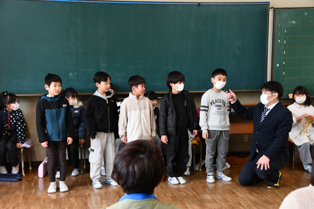 友達がした動きを見て、動きを表す言葉(動詞)を当てるクイズをして、学習したことを確かめていました。「釣り」ではだめで、「釣る」が正解です。