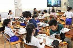 3時間目、3年生は図工でした。楽しかったこと、うれしかったことなど心に残った出来事を絵に表現していました。体をかくのが難しいようです。