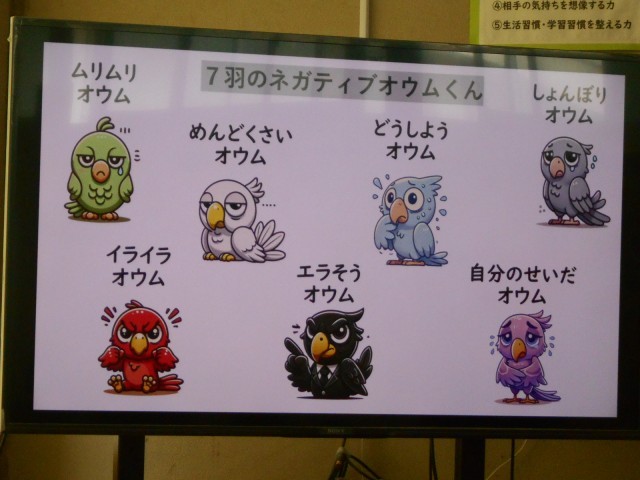 うまくいかないことがあると、悲しくなったりくやしくなったりイライラしたり・・・。そんな時のネガティブな感情を「しょんぼりオウムくん」「イライラオウムくん」などのネガティブオウムくんに例えた後、こうなったらいいなと思うポジティブオウムくんに変身させることで、自分の感情もポジティブに置き換える練習をしました。