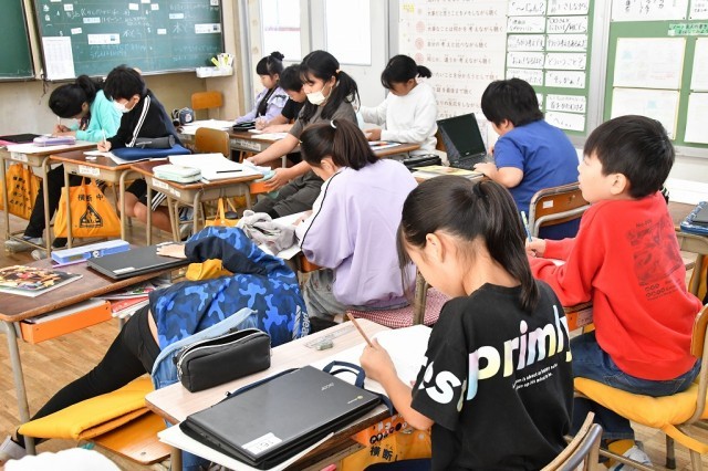 4年生 今日は、どうして題名を「一つの花」にしたのかを学習問題として、グループで考えていました。これまでの話の流れやお父さんの気持ちに着目をして考えているようすでした。