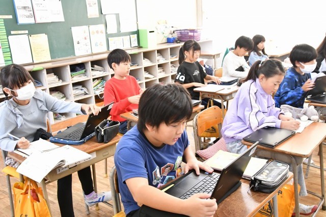 4年生 音楽のリコーダーのテストを一人一人受けていました。待っている間に、各地の音楽について調べていました。青森、長崎、アイヌの曲について、グループになってChromebookで探し聴いていました。