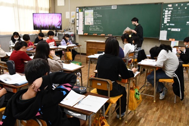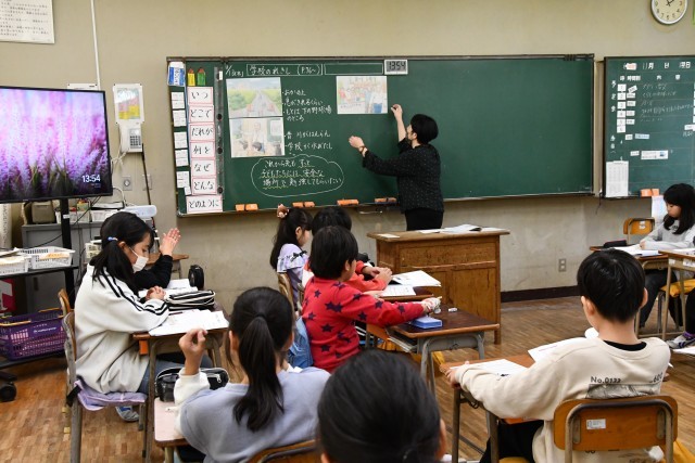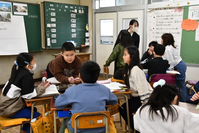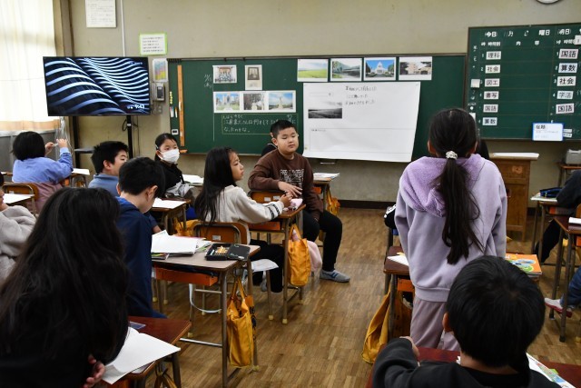 およその数である「がい数」。どんなときに概数を使うかをみんなで考えていまし。4時間目は、国語で学習している「和と洋」についての調査をするため、職員室や事務室にインタビューに来ていました。
