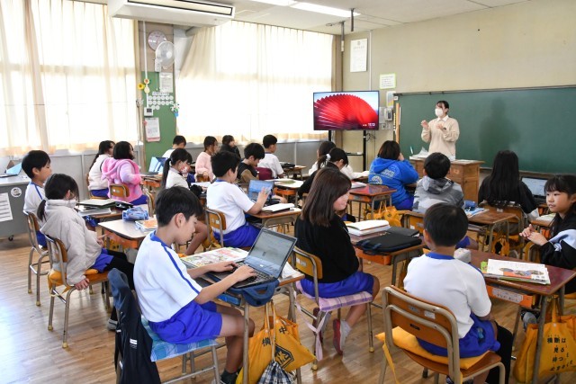 郷土のために尽くした人として、江原素六先生について調べている4年生。調べたことをスライドにまとめていました。