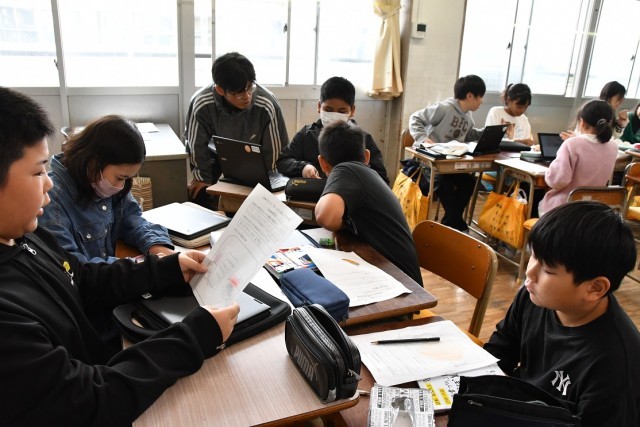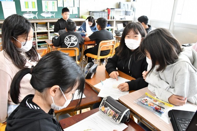 水産業の学習に入り、みんなが疑問に思ったことから学びのプランを作るようで、みんなの意見の一覧を見ながら気がついたことに線を引いていました。魚の捕り方や加工にについて興味や疑問を持っている人が多かったです。