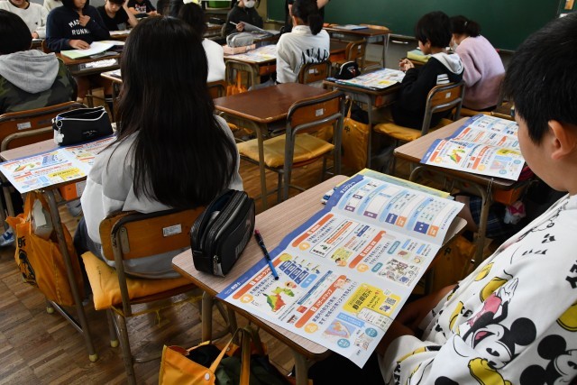 総合的な学習の時間に防災について学習している5年生。ジュニア防災士の資料を見ながら、自分のテーマについて調べる参考にしていました。