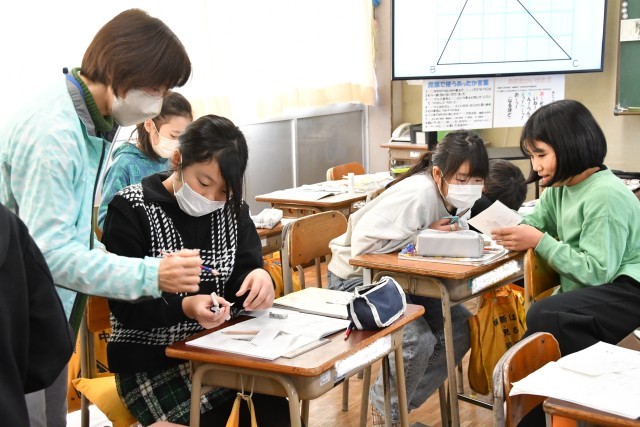 三角形の面積を求めるために、三角形を切りながら平行四辺形や長方形に変形させていました。どのように変形させるかを一生懸命考えていました。