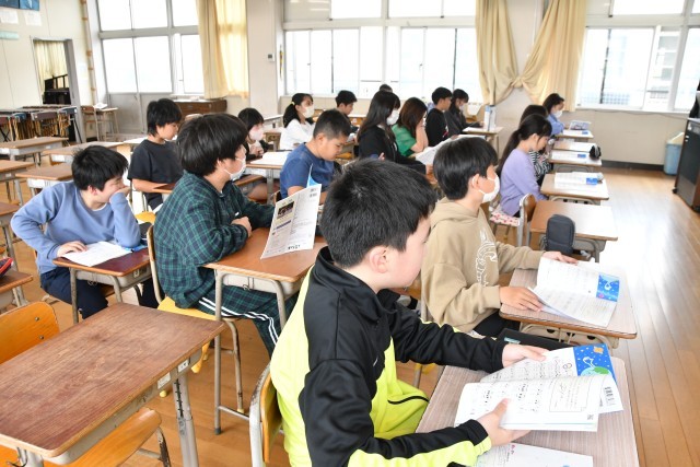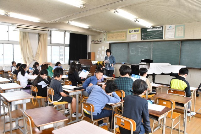 町でどんなことができるか、紹介する文章を聞いて、どの町かを答える学習をしていました。デジタル教科書を使っています。