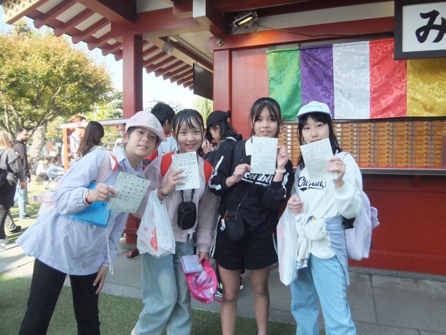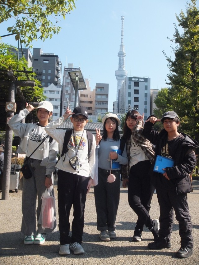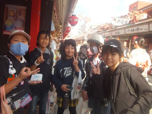 雷門で写真を撮ったグループから、浅草寺まで仲見世をグループで散策しました。お土産を選んだり、1品だけ名物を買って食べてもOKとしました。浅草は食べ歩きが禁止のため、お店前の決まったスペースで立ち止まって食べるルールです。