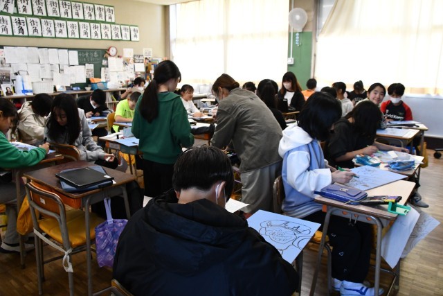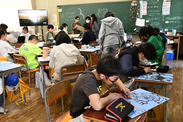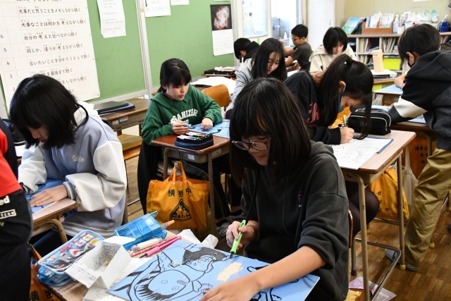 風神・雷神の図の中に、自分が入り込んだおもしろい題材で版画に取り組んでいました。完成が楽しみです。