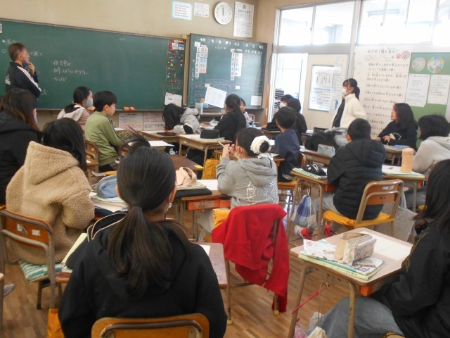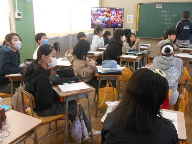 先週の、帯笑園でのお茶席体験について、教科書の室町文化をページを見ながら振り返っていました。和室のつくりや水墨画・生け花など、今も「和風」として継承される日本の文化を、実際に自分の目で見て体験してきたと実感していました。貴重な体験に協力してくださった地域の方に改めて感謝の思いをもっていました。