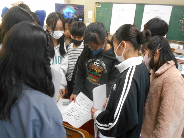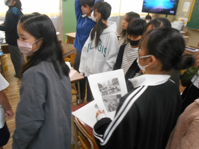 先週の、帯笑園でのお茶席体験について、教科書の室町文化をページを見ながら振り返っていました。和室のつくりや水墨画・生け花など、今も「和風」として継承される日本の文化を、実際に自分の目で見て体験してきたと実感していました。貴重な体験に協力してくださった地域の方に改めて感謝の思いをもっていました。