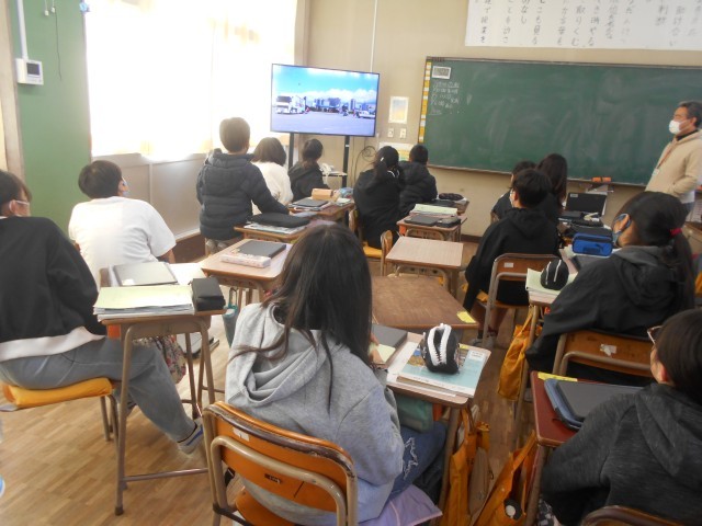 先週の、帯笑園でのお茶席体験について、教科書の室町文化をページを見ながら振り返っていました。和室のつくりや水墨画・生け花など、今も「和風」として継承される日本の文化を、実際に自分の目で見て体験してきたと実感していました。貴重な体験に協力してくださった地域の方に改めて感謝の思いをもっていました。