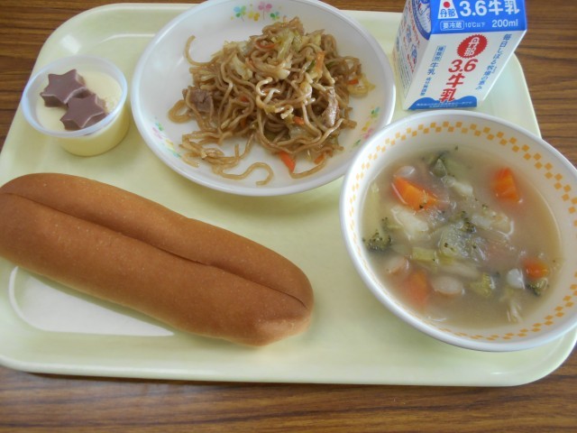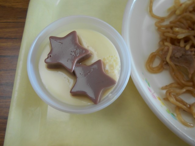焼きそばを、コッペパンにはさんで焼きそばパンにして食べます。今日のスープは、給食委員会さんが給食の時間に流してくれる「森のスープ屋さん」をイメージして栄養士さんが考案したスープです。手作りプリンには、ココア味のきら星が光っていました!