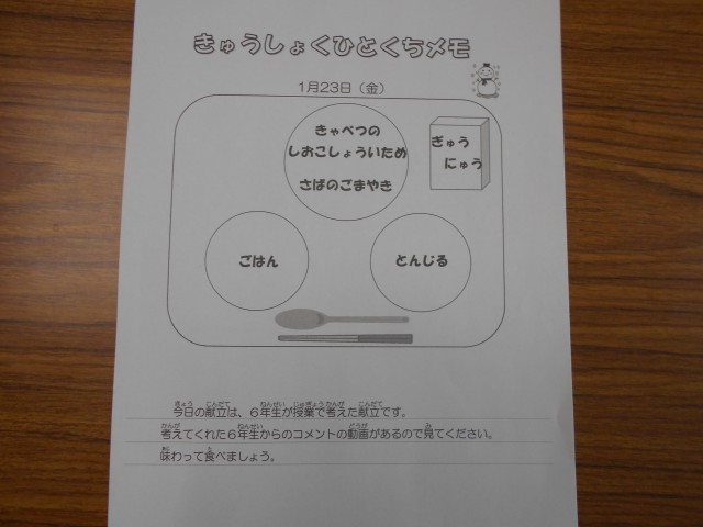 1月23日(金) 今日の給食~6年生が考えたメニュー~