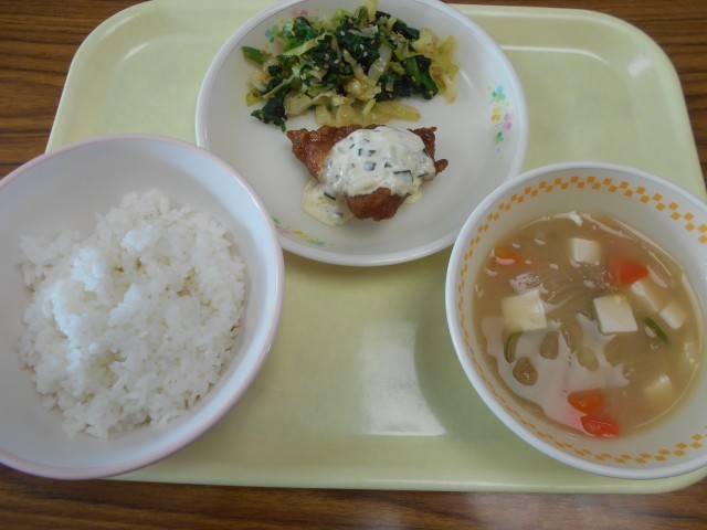 チキン南蛮は、給食で初めて提供するメニューです。タルタルソースが甘酸っぱいチキン南蛮とぴったりマッチしていました。みそ汁には、旬の大根や根深などがたっぷり入り、野菜の甘さたっぷりのみそ汁でした。各学級で、給食の紹介動画を流しました。献立を考えた6年生は、旬の食材をたくさん使って考えたと思いを伝えてくれました。