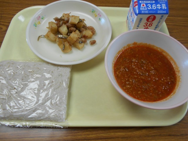 ソフトめんミートソースは、子供たちにも大人気の給食の定番メニューです。手作りのミートソースは、具だくさんで本格的。とてもおいしいです。今週は、天気のいい日が続きそうです。パワーを付けてがんばっていきましょう!