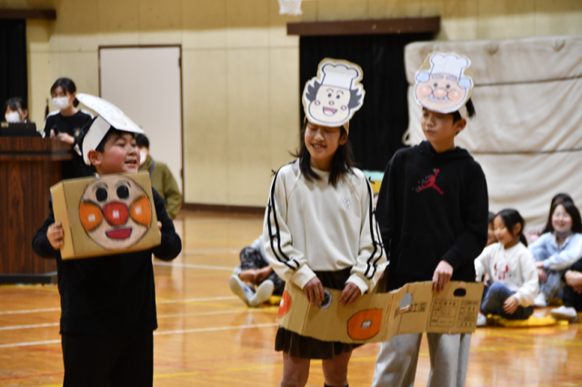 企画した5年生は、かばおくんをいじめるばいきんマンたちから、アンパンマンとその仲間が、原東小のみんな協力して救出するという劇で会を進行させました。協力し合い、会を盛り上げました。6年生だけでなく、全校を笑顔にさせてくれました。