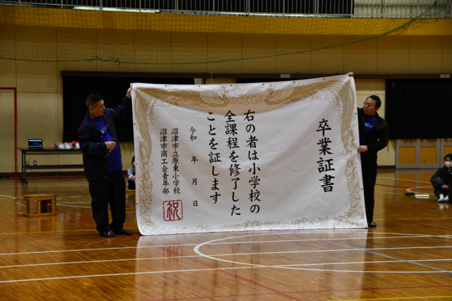 沼津市商工会原支部青年部様より、卒業証書の記念写真用横断幕を寄贈いただきました。今年から卒業式の時、中央廊下に貼りますので、その前で記念撮影をしてください。沼津市商工会原支部青年部様、ありがとうございました。