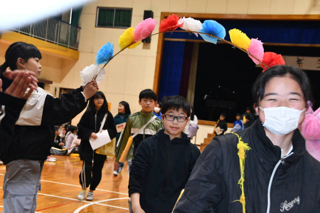 4年生は、雁作太鼓と「茶色のこびん」の合奏をコラボさせたオリジナル楽曲で6年生にエールを送りました。