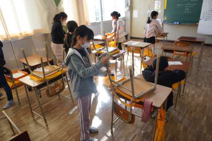 3年生は大掃除をしていました。机や椅子の脚についてゴミを取ります。