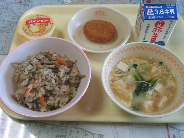 今日の給食は、「クープジューシー、牛乳、大豆コロッケ、卵と豆腐のスープ、パインゼリー」でした。「クープジューシー」は沖縄県の郷土料理で、「クープ」は昆布、「ジューシー」は炊き込みご飯という意味です。みんなで美味しくいただきました。