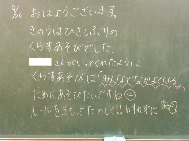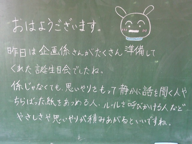 学級担任が黒板メッセージを用意して子供たちの登校を待ちます。
