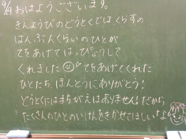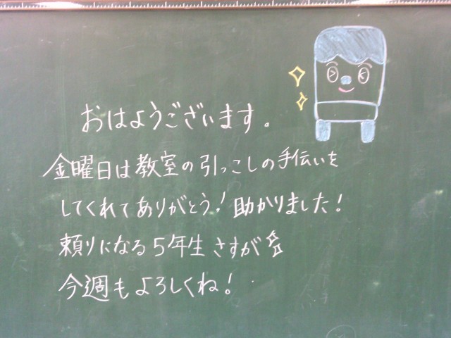 学級担任が黒板メッセージを準備しています。子供たちもそれを見ながら入室します。