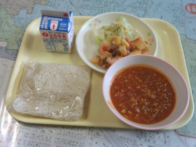 今日の給食は、「ソフト麺(ミートソース)、牛乳、小エビとポテトのから揚げ、ボイルドサラダ」でした。みんなで美味しくいただきました。