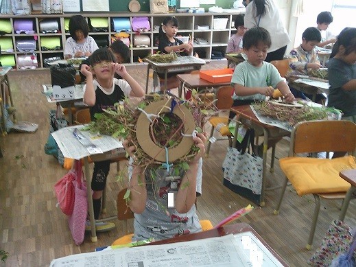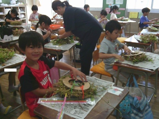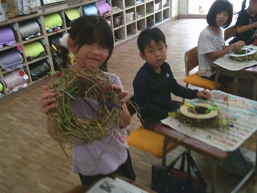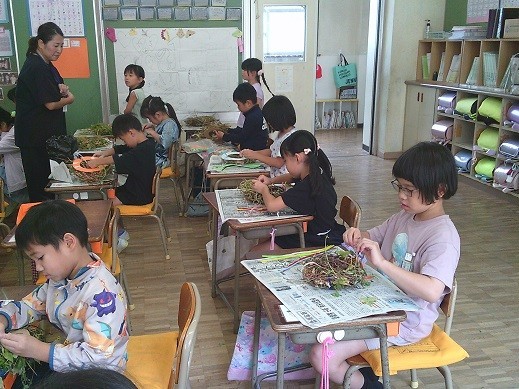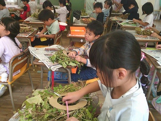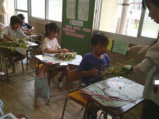1年生は、生活科でアサガオのツルを使ってリース作りを行います。今日は1年3組の児童がリース制作を行いました。1・2組は明日以降の制作となります。