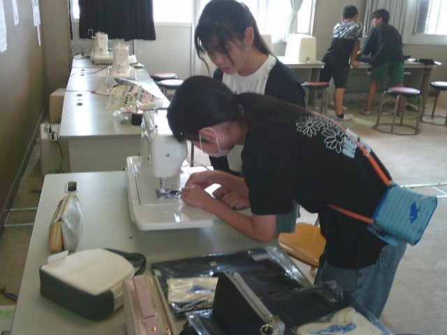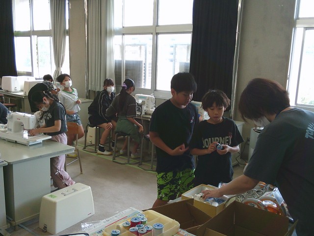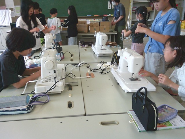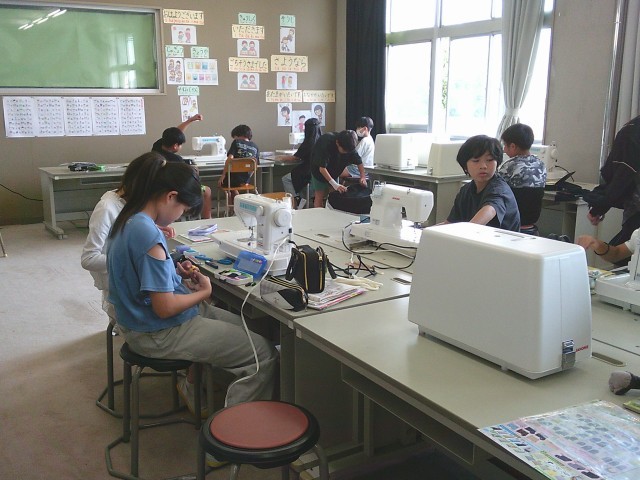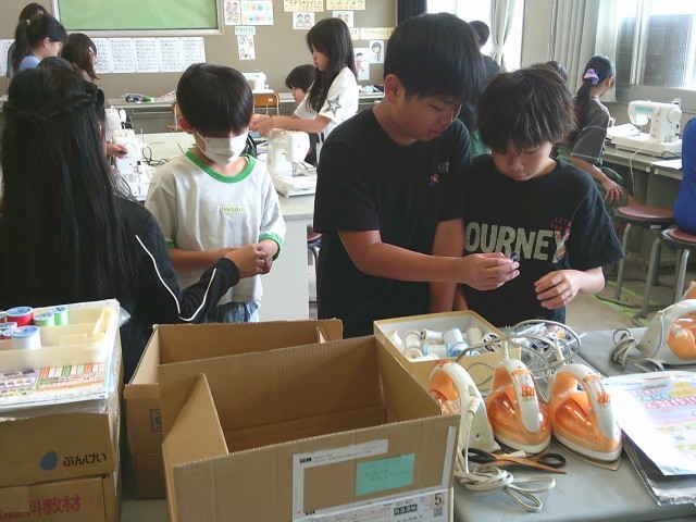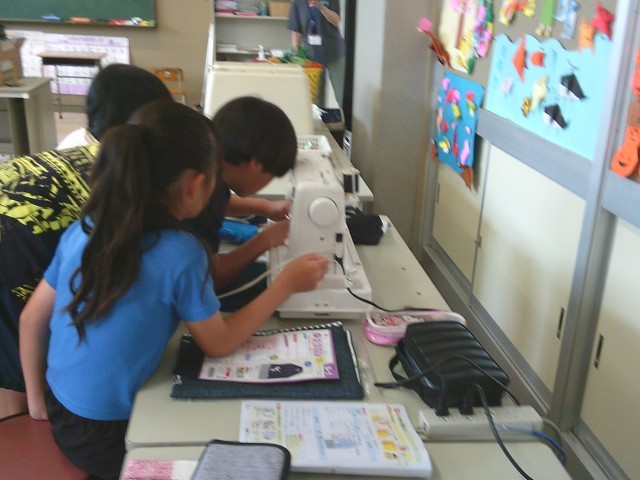 5年生は、家庭科でミシンを使ったエプロン制作を行っています。ミシンの使い方を学んだ後、早速ミシンを使ってみました。