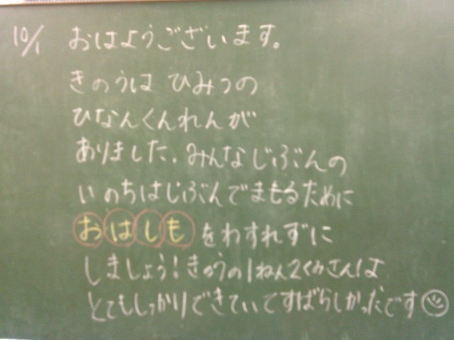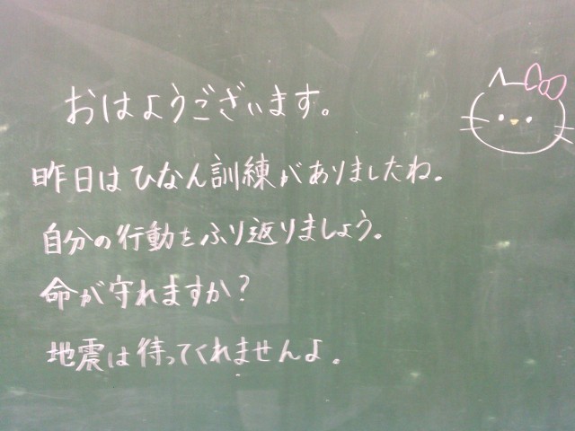 学級担任が黒板メッセージを用意して子供たちの登校を待ちます。昨日の地震避難訓練のことに触れています。