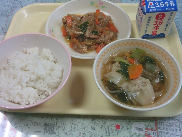 今日の給食は、「ご飯、牛乳、スタミナ焼き肉、ワンタンスープ」です。今日はみんなの大好きなスタミナ焼き肉でした。美味しくいただきました。