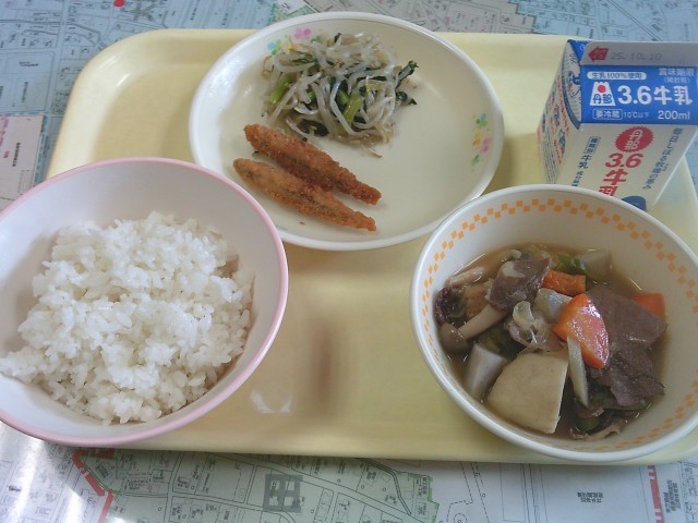 今日の給食は、「ご飯、牛乳、芋煮、きびなごフライ、もやしと小松菜の炒め物」でした。みんなで美味しくいただきました。