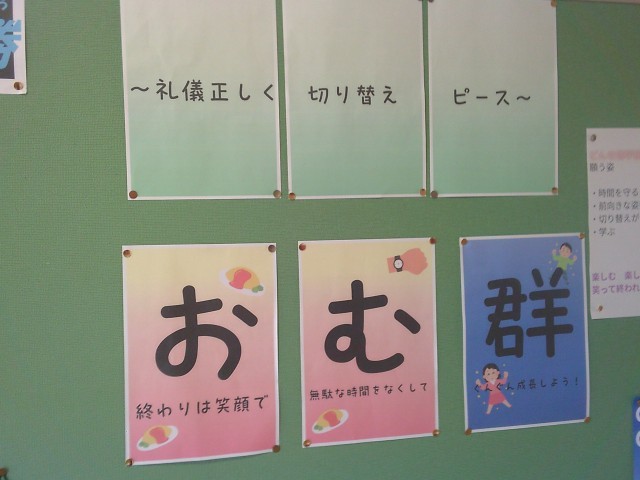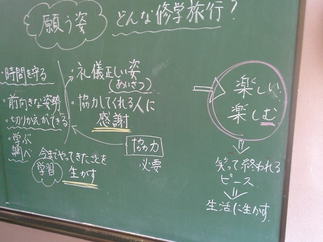 「おむ群」にも意味があります。1組学級目標の「おむらいす」と2組学級目標の「群青」を合わせただけではありません。「おむ群」の「お」は「おわりは笑顔で」、「む」は「むだな時間は無くして」、「群」は「ぐんぐん成長しよう」です。修学旅行スローガン達成に向けて、今日も準備を進めていきます。