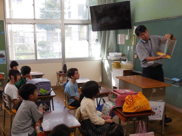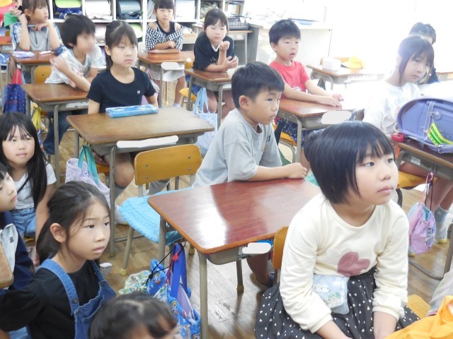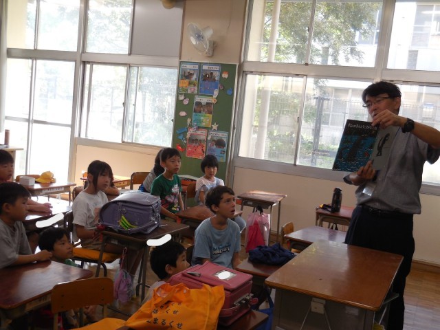 2年2組は、校長先生による朝の読み聞かせでした。国語で、「ニャーゴ」の教材の学習に入っているため、数日前から、みやにしたつやさんの本を紹介しています。今日は、「きみは本当にすてきだね」の本でした。みんな真剣に聞き入っていました。