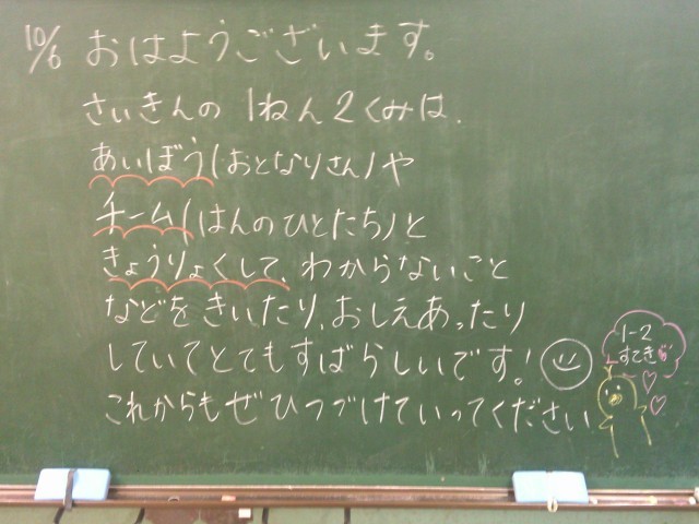 学級担任が黒板メッセージを準備して、子供たちの登校を待ちます。子供たちもそれを楽しみにしています。