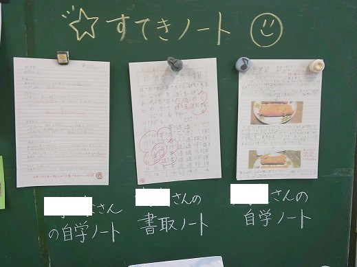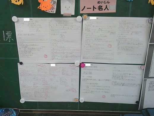 各クラスでは、「すてきなノート」「ノート名人」等の名称で、上手にノートを取っている子をクラス内で紹介しています。
