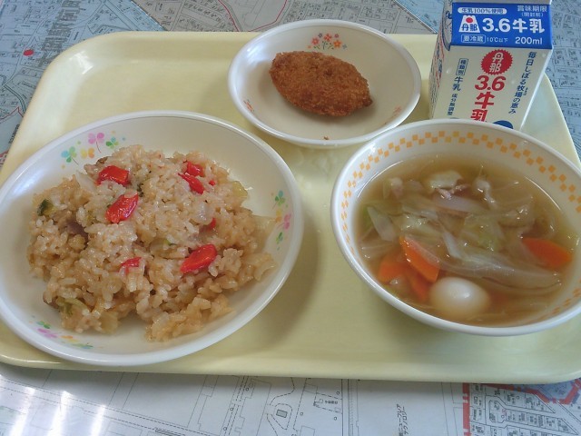 今日の給食は、「ナシゴレン、牛乳、コーンコロッケ、うずらの卵と野菜のスープ」でした。みんなで美味しくいただきました。