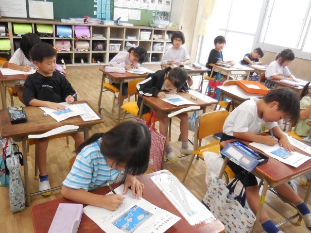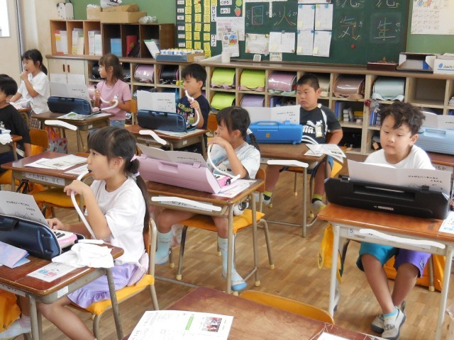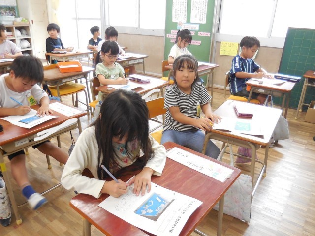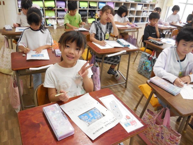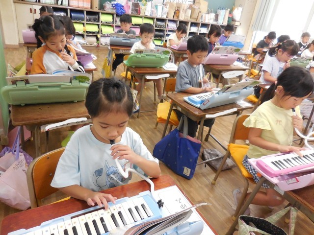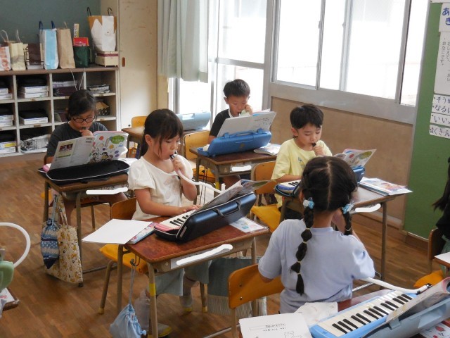 メロディオンで、ドレミファソやソファミレドの練習をしました。図工の作品も仕上がったので、振り返りをしていました。