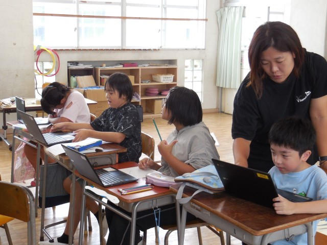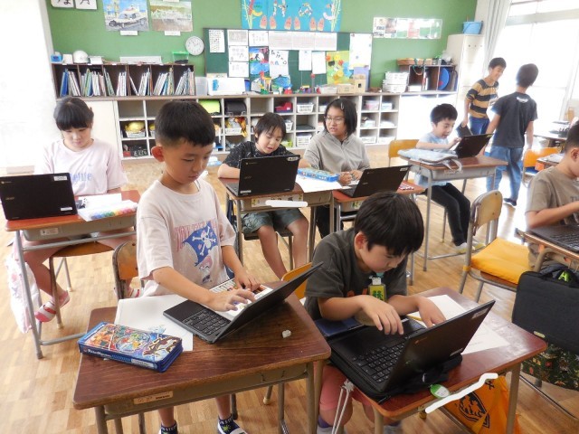 6年生がいないため、1組と2組合同で図工の授業を行いました。パソコンで絵を描くことを楽しんでいました。